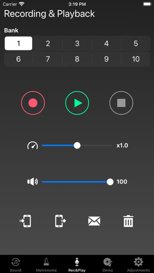 You can also save the performance data from RB-9000 series to your iOS device, where you can send it to someone else via email, or receive new performance data and play it back on your RB-9000 series.