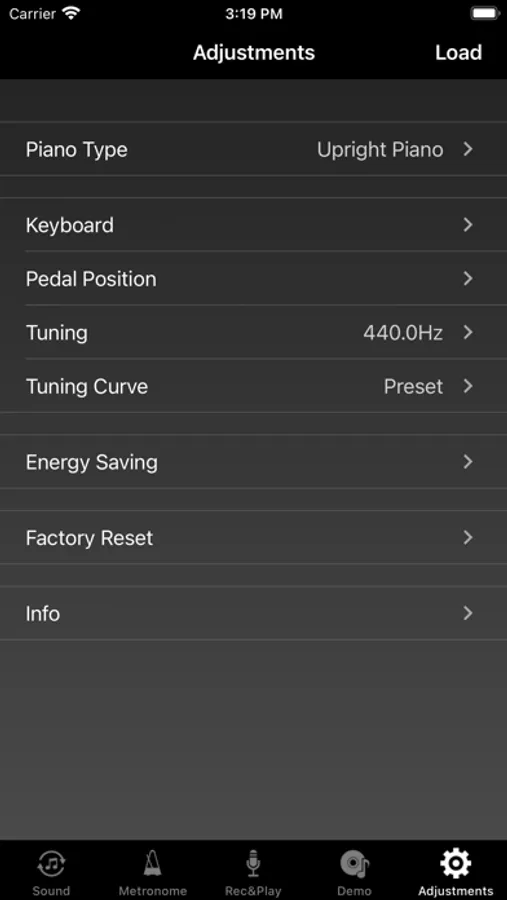 * Adjustments - Piano type, Touch control, Individual key volume, Black key volume, Key depth, Note repeat limit, Pedal position, Tuning, Tuning curve, Panel led, Auto Power Off, Factory reset