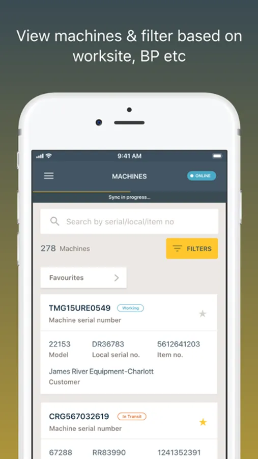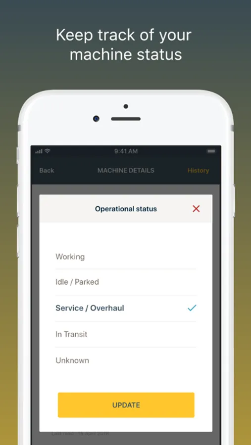 • Update and track key metrics of your Machine (operational status, Hour counters, location etc.)