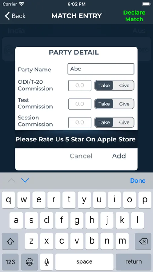 - User can Add Party, Add Match, Add Session, Show