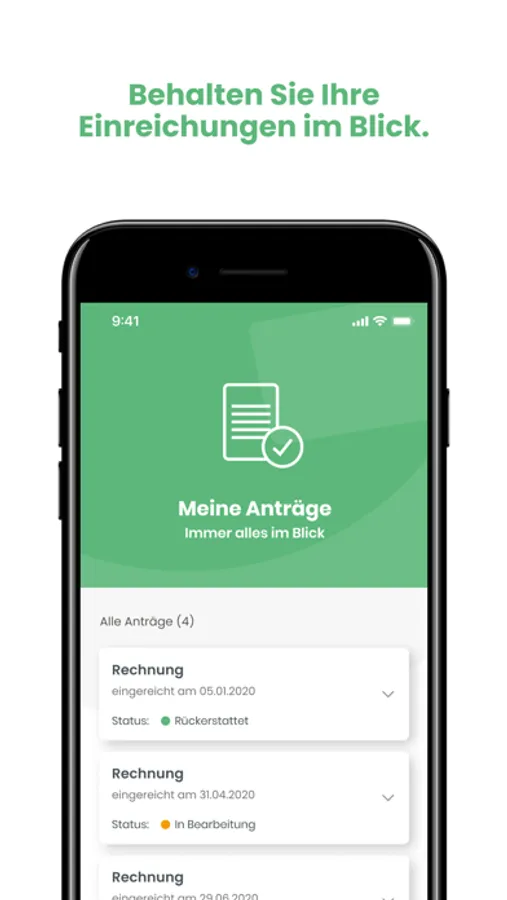 • Transparent: Behalten Sie den Status Ihrer Einreichungen und den Saldo Ihres Beitragskontos immer und überall im Blick.
