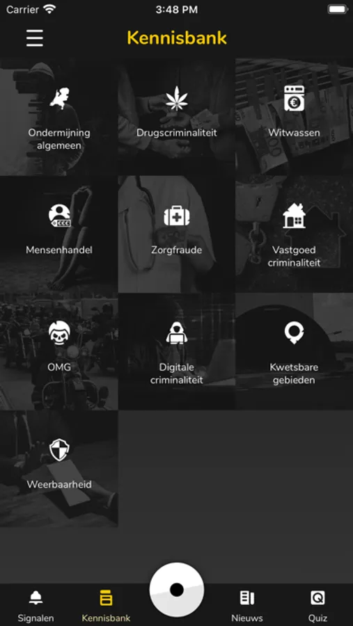 • Nieuws: dagelijkse nieuwsberichten over ondermijning, geordend per thema en