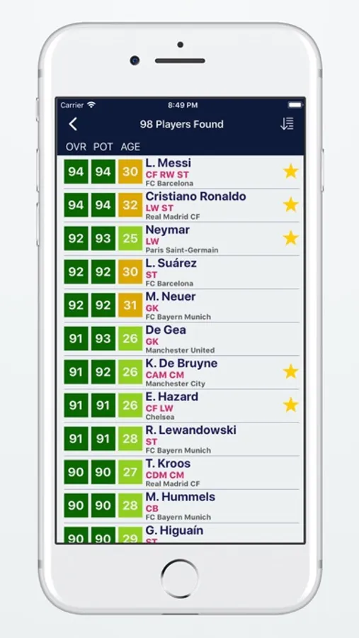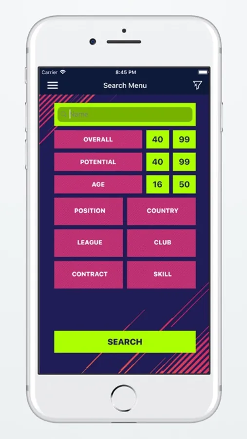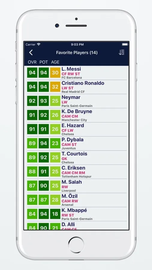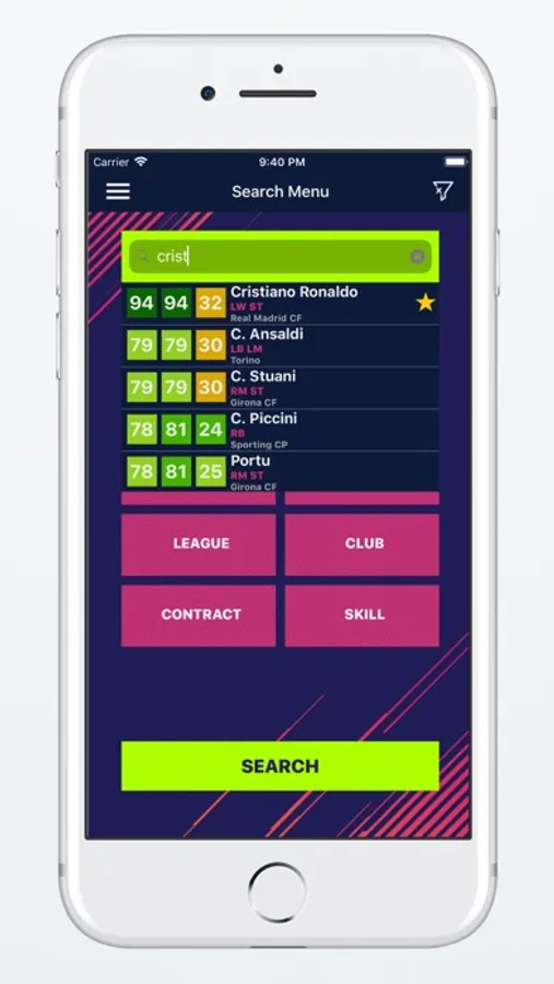 Player Potentials 18 application has 9 different free filter options. With Overall Rating, Potential Rating, Age, Preferred Positions, Nationality, League, Club, Contract and Skill filters it is very easy to search and find players for your career mode team in FIFA 18 game. This application will be your biggest guide during the transfer seasons.