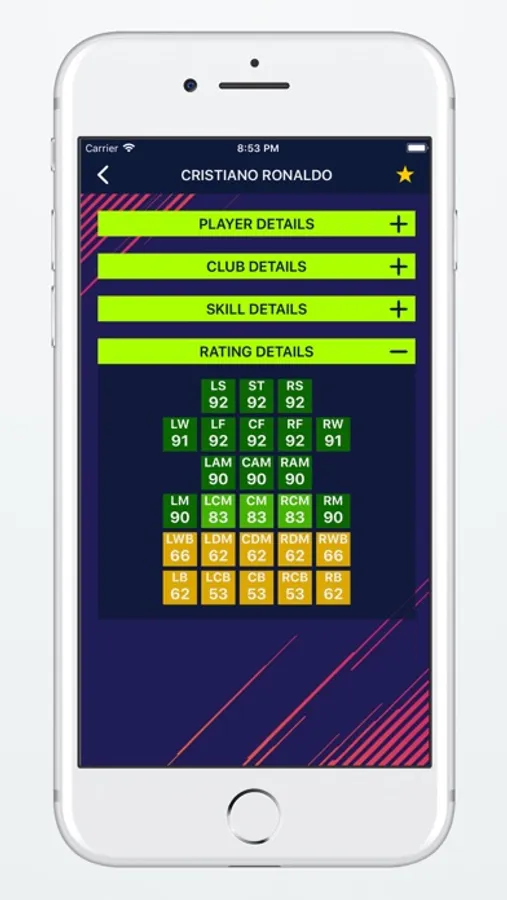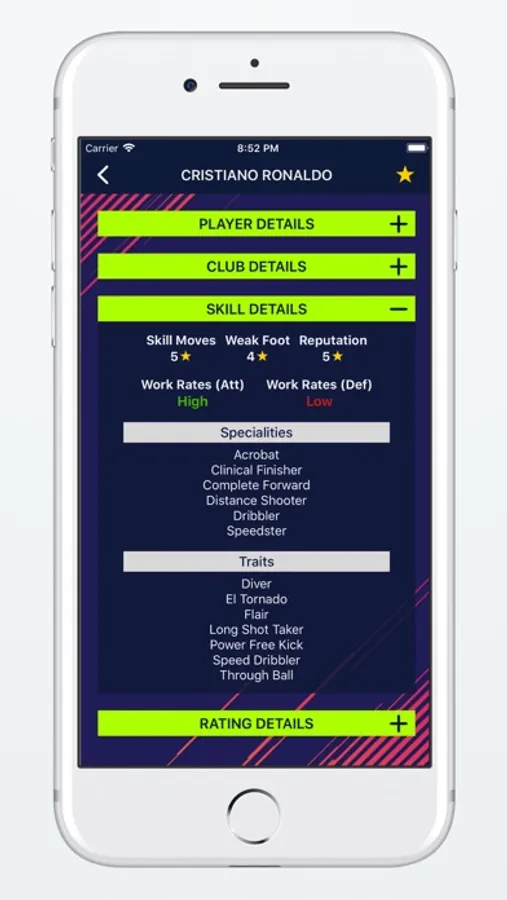 In Player Details page you can see very detailed data like Player Photo, Player Full Name, Preferred Positions, Preferred Foot, Day Of Birth, Height, Weight, Contract End Date, Wage, Value, Release Clause, Specialities, Traits, Weak Foot, Skill Moves, Work Rates, Player Ratings Per Positions.