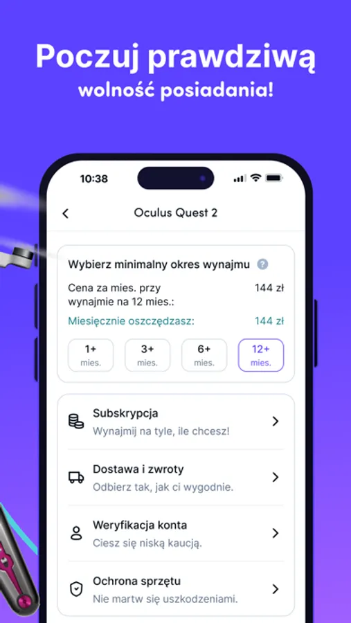 W Plenti oferujemy model Subskrypcji, który umożliwia wypożyczenie sprzętu na okres 1, 3, 6 lub 12 miesięcy, ale możesz korzystać z niego tak długo, jak chcesz. Jeśli nie zwrócisz produktu w zadeklarowanym czasie, wynajem automatycznie przedłuży się o kolejny miesiąc. Co ważne, wybierając dłuższy okres wynajmu, zapłacisz znacznie mniej za miesiąc. Tym samym korzystanie z najnowszych urządzeń elektronicznych stanie się jeszcze bardziej opłacalne i dostępne dla każdego.
