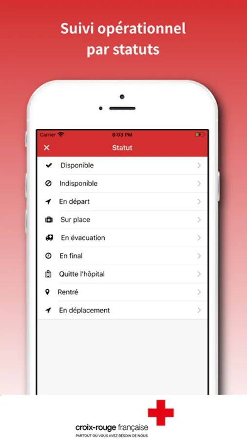 • Statut au cours d'une intervention (sur place, disponible...),