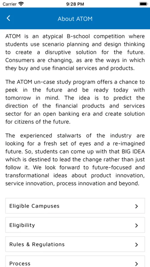 The ATOM is an un-case study competition by Bajaj Finserv. where students from premier B-Schools use scenario planning and design thinking to create a disruptive solution for the future.