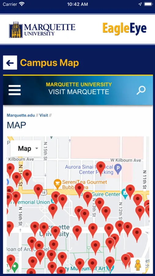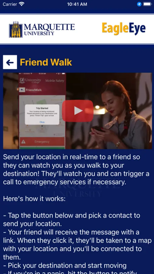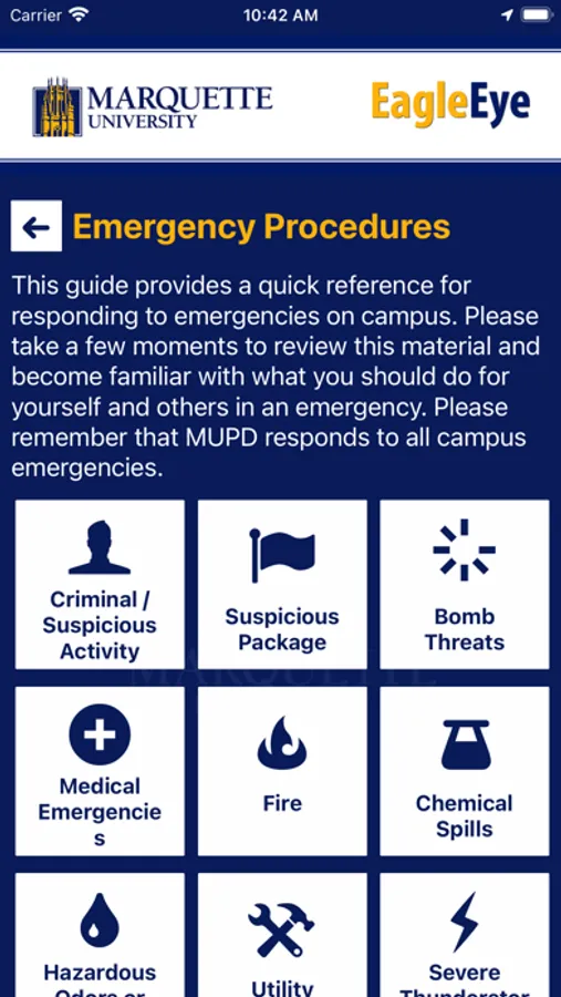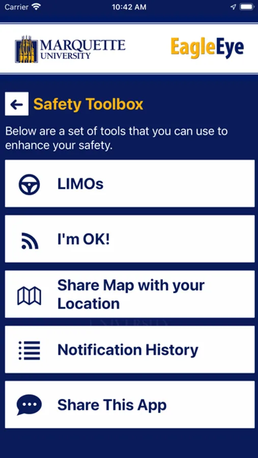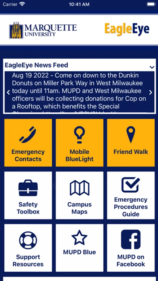 EagleEye is the official safety app of Marquette University. It is the only app that integrates with Marquette University's safety and security systems. Marquette University Police Department has worked to develop a unique app that provides students, faculty and staff with added safety on the Marquette University campus. The app will send you important safety alerts and provide instant access to campus safety resources.