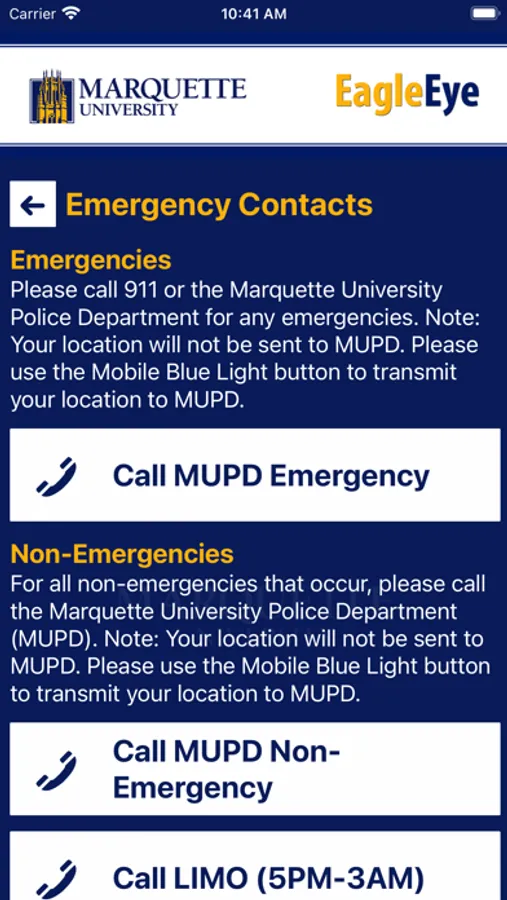 - Mobile Bluelight: Send your location to Marquette University security in real-time in case of a crisis