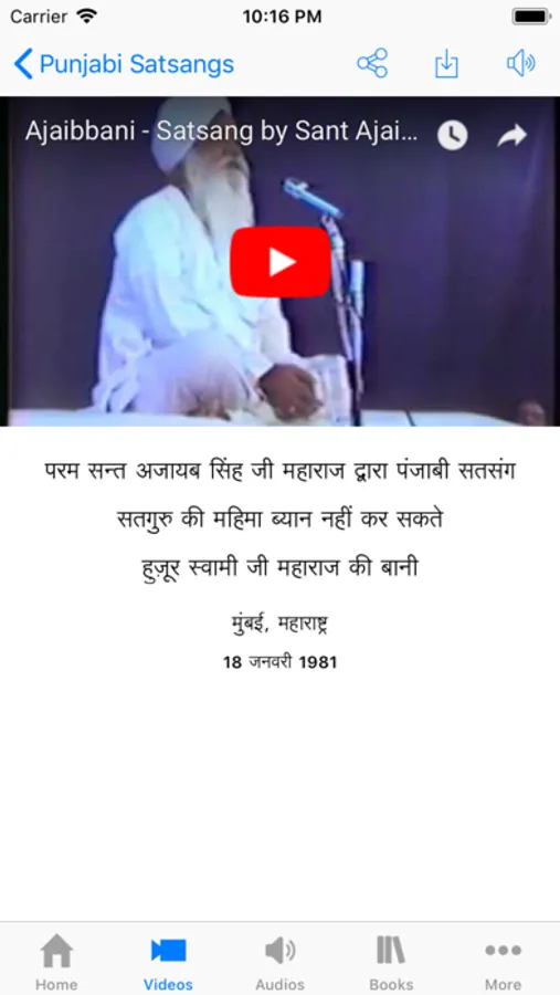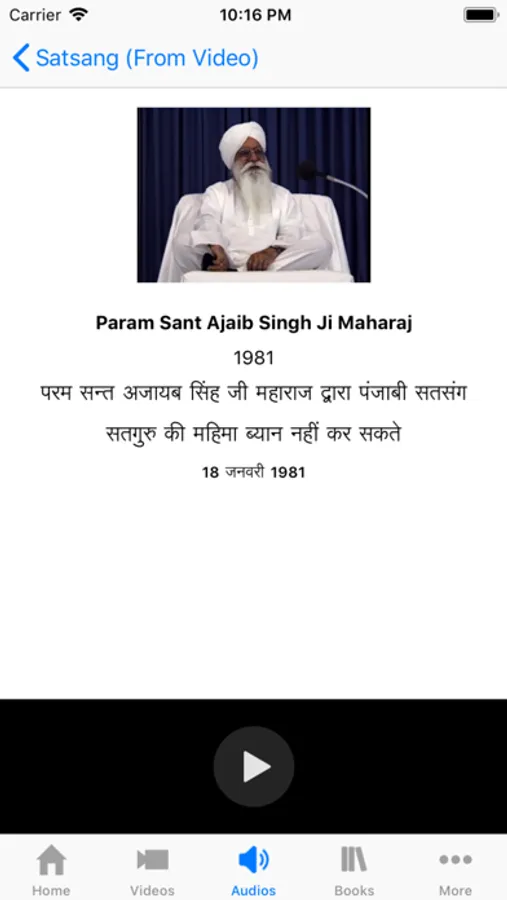 Ajaib Bani ios app is the official app created by Sant Bani Ashram 16 PS Rajasthan, India concerning the information about various Satsang and Meditation programmes & events organized by Satsangi's of Sant Ajaib Singh ji. Sant Ajaib Singh ji's Love for His Guru Sant Kirpal Singh & Maharaj Sawan Singh is reflected in His songs ( Bhajans) & satsang discourses which is being compiled in this app for the benefit of His sangat(Followers) far & wide.