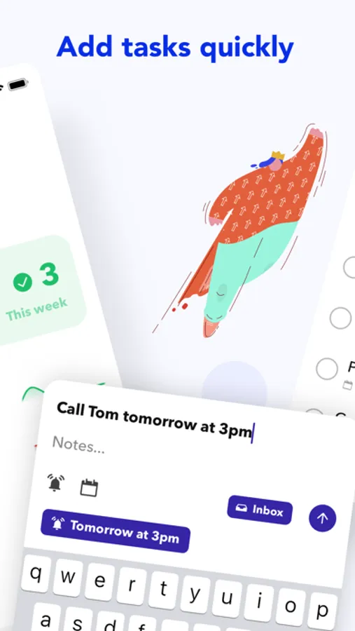 Use phrases like "tomorrow at 3 pm" when creating a task to quickly set up proper dates and reminders. Use "#" to add labels/tags.