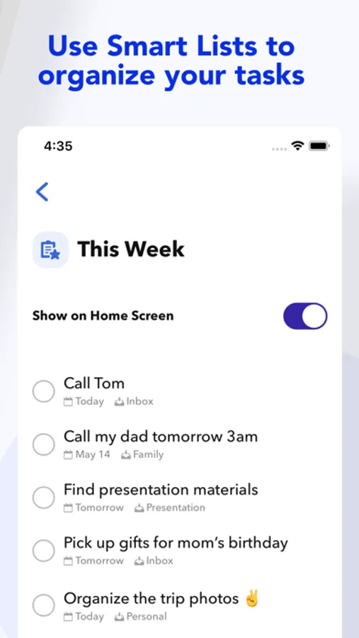 Quickly create and organize your tasks and to-do lists. Create reminders or repeating tasks.