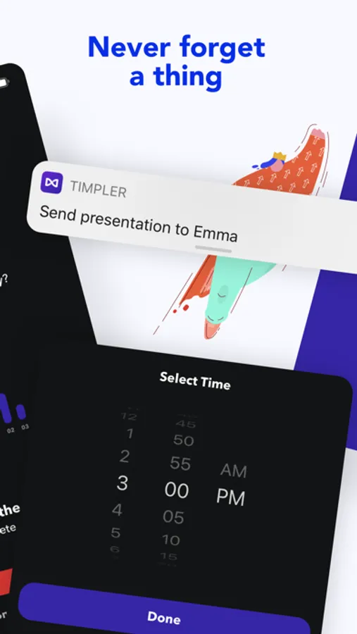 Timpler will schedule habits like "Go running 3 times a week" automatically adding suggestions to your daily agenda. You can customize habits to occur only on selected days of the week. You can also set up reminders at a fixed time or select "Auto" mode and let Timpler try to find the best time for your habit