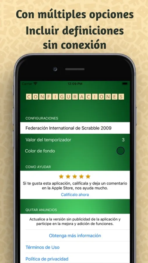 Para aficionados y profesionales, esta aplicación incluye la lista completa de palabras autorizadas por el juego oficial de Scrabble®.