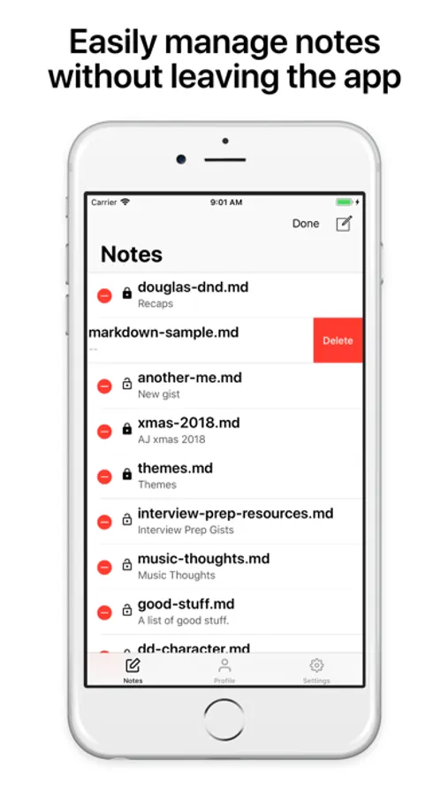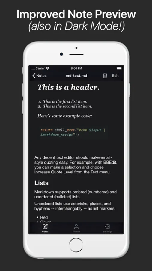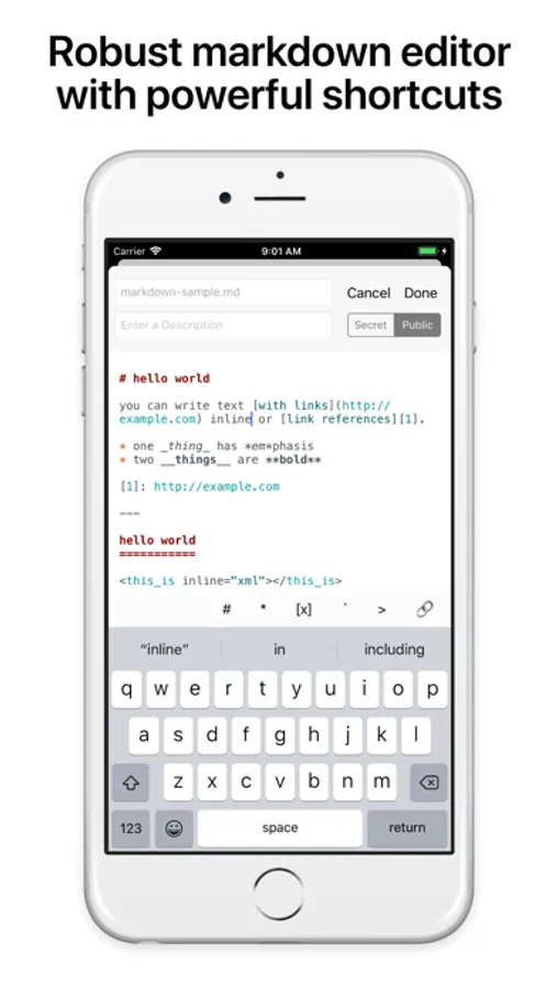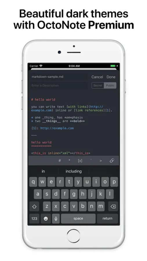 For everyone, markdown enables beautiful page rendering, making markdown notes like single-page websites unto themselves. Easily share OctoNote notes in the app or by sharing the Gist URL to your note and enjoy the robust GitHub markdown rendering in the browser.
