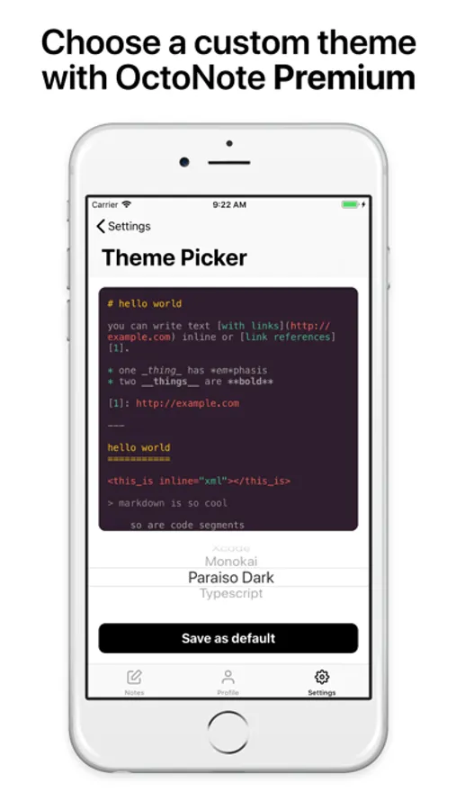 With OctoNote Premium, you can create, edit, and manage secret notes - notes that don't show up as public on GitHub or in search engine results. Also with Premium - you can also customize your note-editor experience with custom themes!