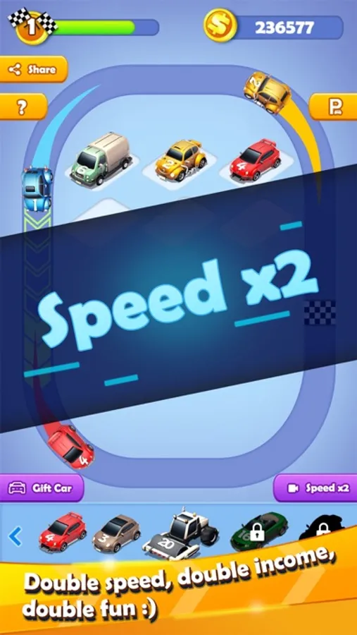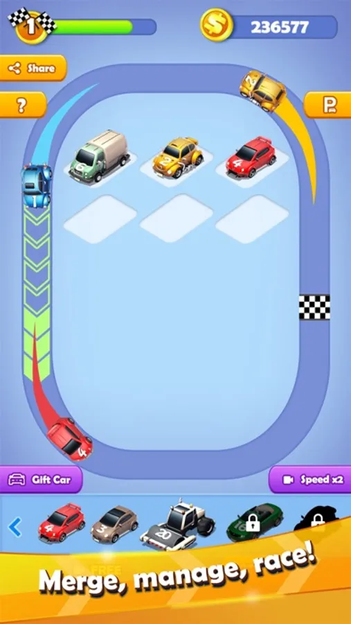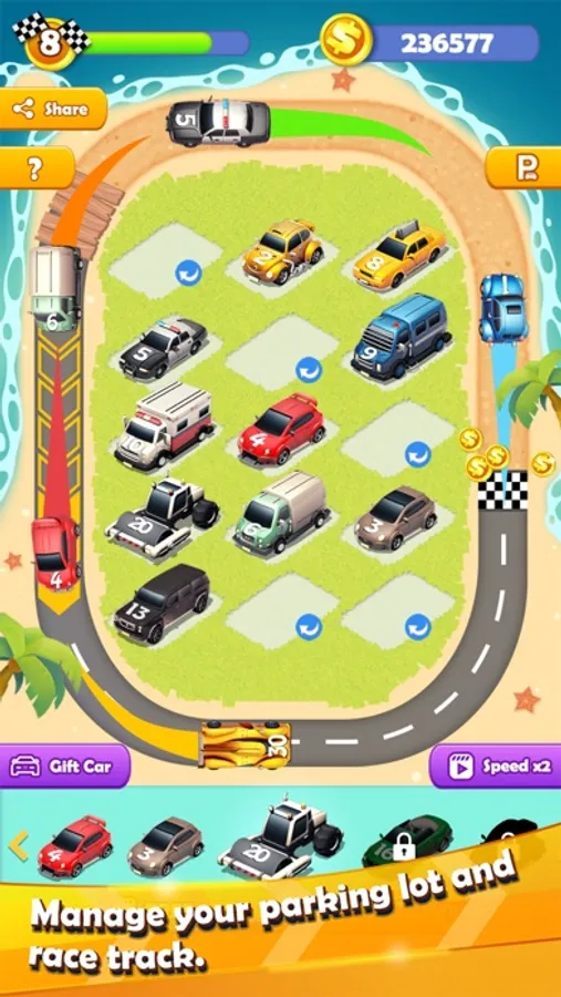 Manage your parking lot and race track. Buy and manage your sports cars so you can make them race to earn money!