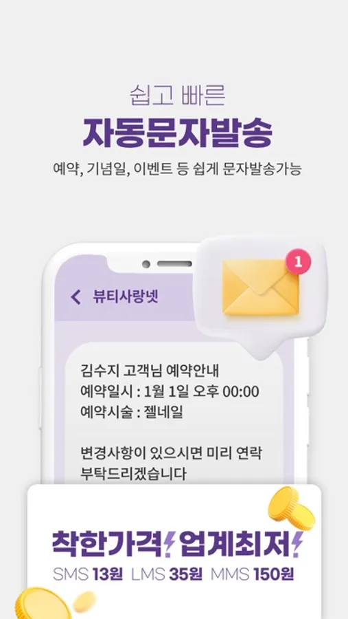 SMS 13원 LMS 35원 MMS 150원의 저렴한 문자메세지 비용!