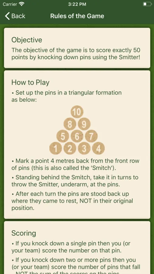 Similar to skittles, with a bit of a twist, Smite players must throw a wooden 'Smitter' at a formation of 10 wooden pins. The aim of the game is to score exactly 50 points.