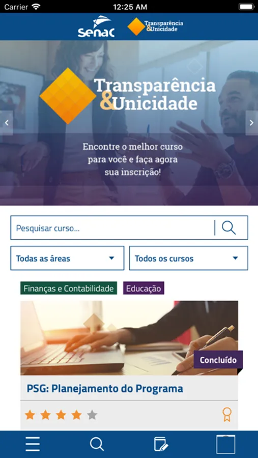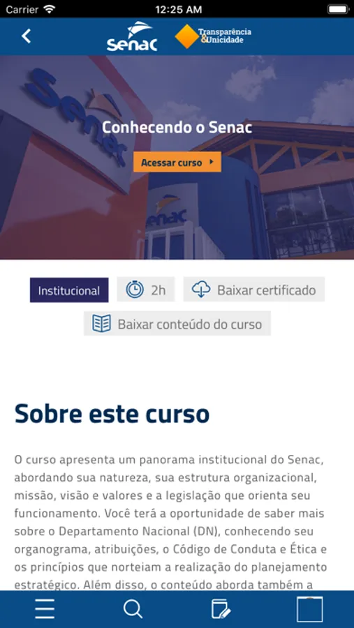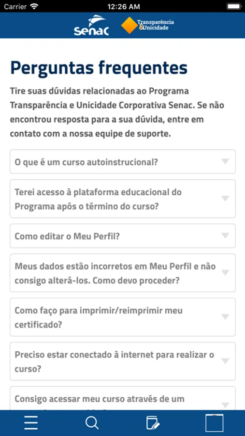 Seja bem-vindo ao aplicativo do Programa Transparência e Unicidade, que permite acesso a cursos corporativos voltados ao autodesenvolvimento e o alinhamento institucional. Usuários cadastrados de qualquer unidade do SENAC poderão ter acesso ao portfólio de cursos.