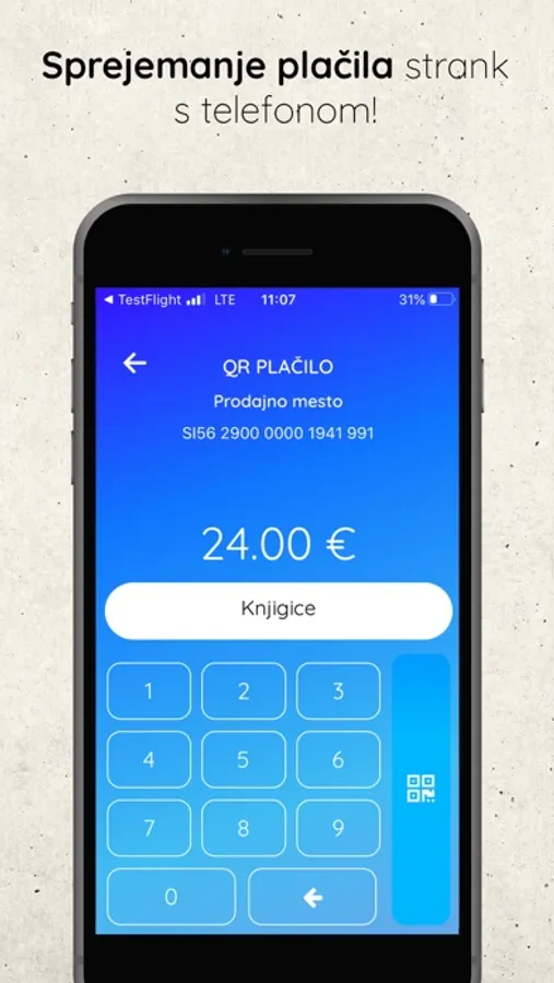 2. Vpišite znesek in namen računa ter kupcu prikažite QR kodo.