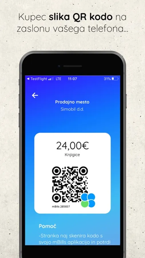 3. Vaš kupec s svojo mBills aplikacijo slika QR kodo in potrdi plačilo.