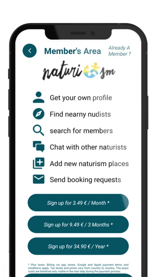 If you want more features and direct contact with other naturists, just become a member! Then you can create a personal profile, find other people with the same interests and chat. As a member, you also have the opportunity to write descriptions of naturist locations, rate them and even create new spots. You can also send booking requests to hotels and resorts to better plan your vacation. All for a small monthly fee.