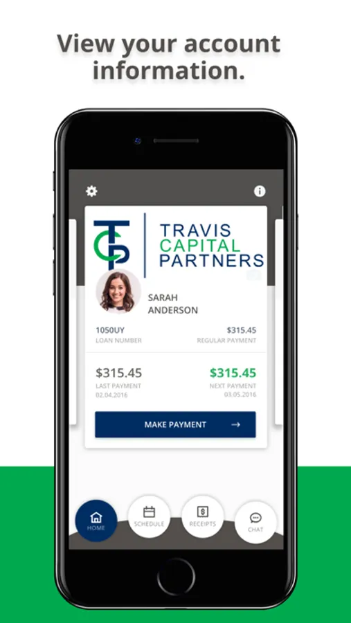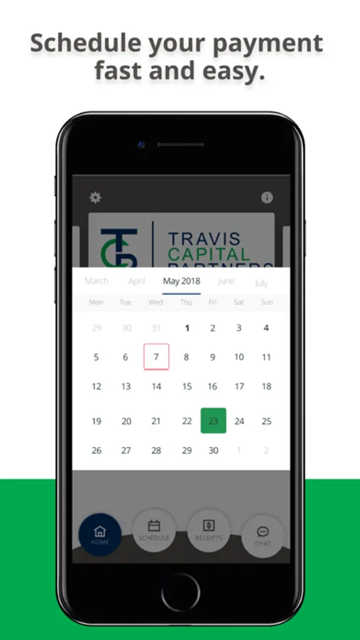 Make and schedule your Travis Capital payment in real-time. The Travis Capital App is the easiest way to make your payment, see your payment history, and chat with your provider. It's fast and easy.