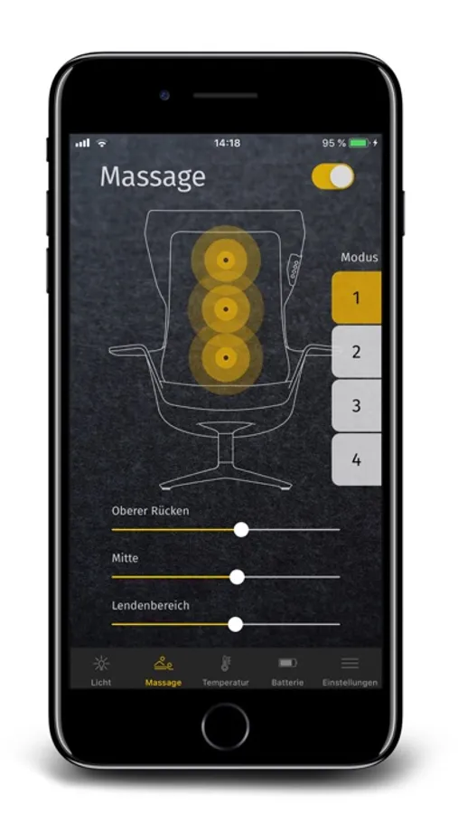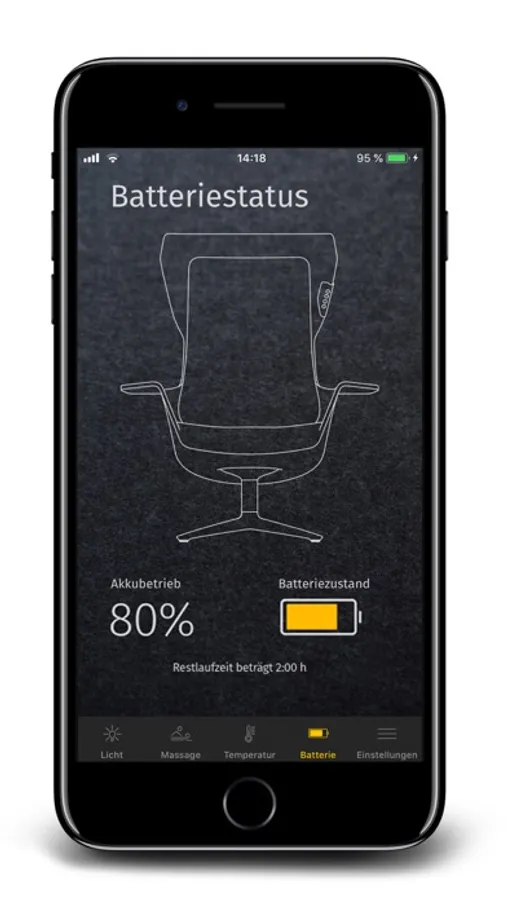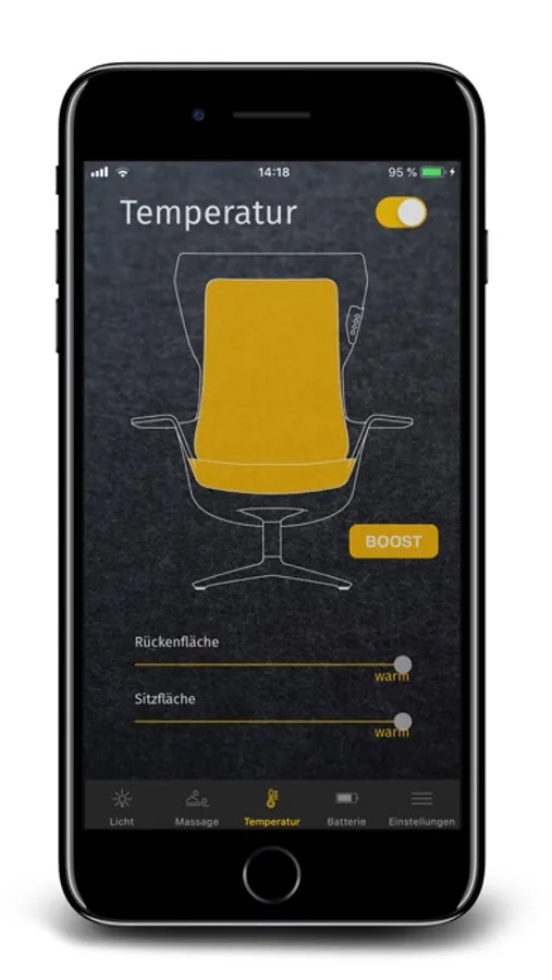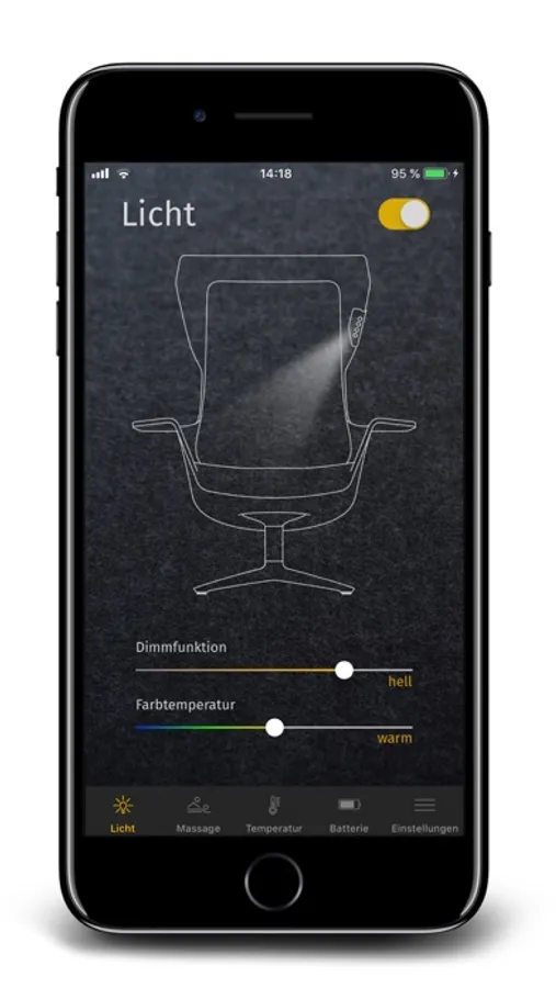 Die Bedienung der elektronischen Funktionen des Lesesssels WOOOM geschieht komfortabel mit dieser App. Genießen Sie Technologie, die Spaß macht und guttut. WOOOM hat alles, was ihr Schreibtisch-Arbeitsplatz auch hat. Plus Wohlfühlfaktor.