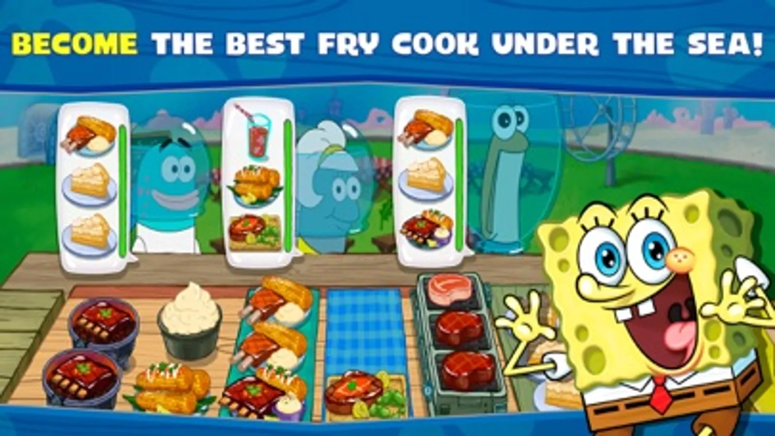 Cook and serve up delicious food including Krabby Patties, pancakes, BBQ and more! Get behind the grill as SpongeBob SquarePants to provide speedy service to the residents of Bikini Bottom. You’ll serve tons of familiar faces like Patrick Star, Sandy Cheeks, Squidward and many more! Keep your customers happy and be rewarded with tips, likes and exciting bonuses! Start as a junior fry cook and train to become one of Bikini Bottom’s premier fast-food chefs!