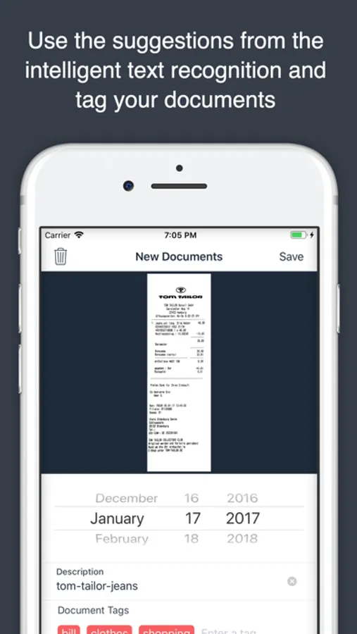 • PDF Archiver analysis the document locally and suggests tags and the document date.