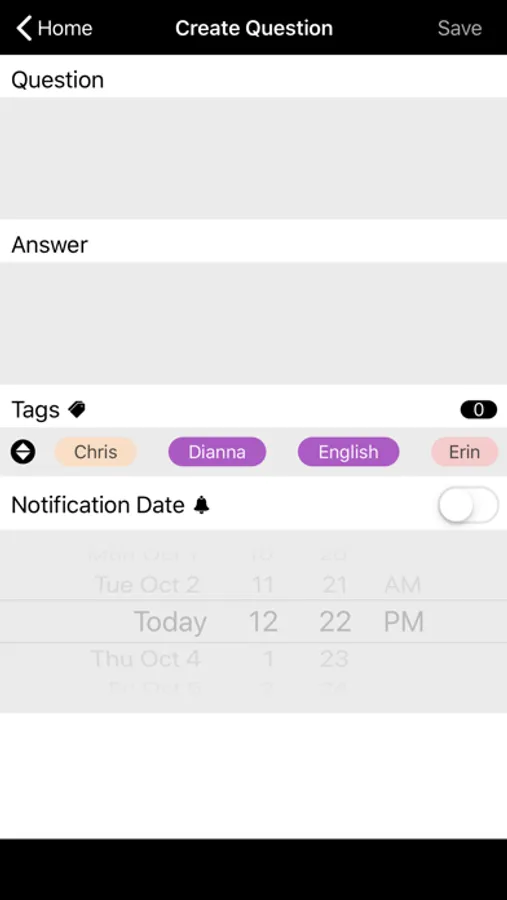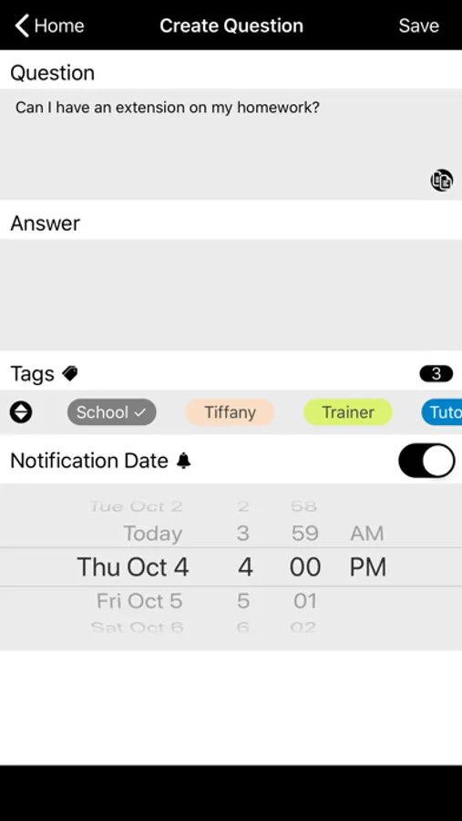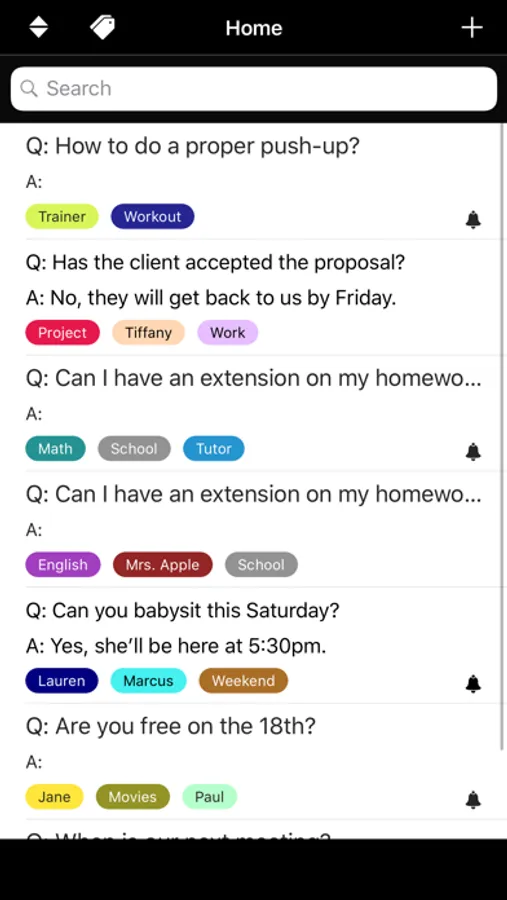 Have a question you'd like to remember to ask someone later? QA can hold onto that question and notify you when the time comes to remember to ask it. You can then record the answer in the app and refer to it later.