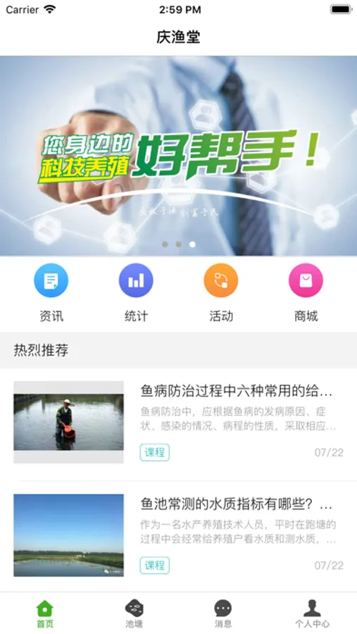 庆渔堂智慧水产养殖系统是浙江庆渔堂农业科技有限公司推出的智慧水产客户端,可以实时监测鱼塘水中溶氧与温度等主要指标,结合增氧设备状态检测和远程开关,主要功能包括:溶氧实时监测、增氧设备手、自动开关控制、溶氧曲线分析、报警提示、养殖动态资讯、实时天气预报、一键咨询拨号等。可有效降低养殖风险和养殖成本,及时预防水质变化,提高水产养殖收入。