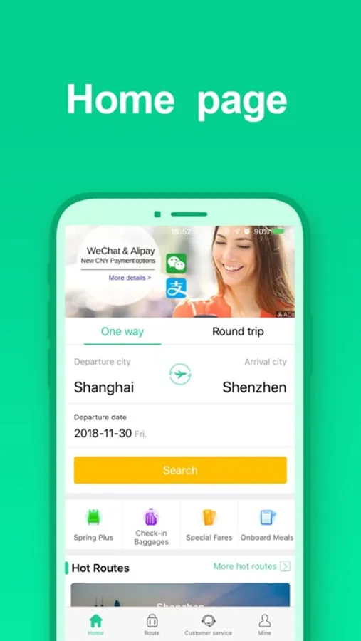 Spring Airlines offers you a full range of ticketing services, including: air ticket booking, hotel reservations, flight dynamic inquiries, ancillary service products purchasing, online check-in, online seat selection, ticket verification, ticket refund and change, airport assistant, etc. Enjoy cheaper tickets and more convenient booking through Spring Airlines' APP!