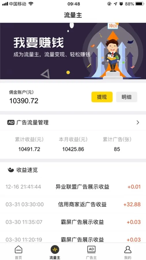 .流量主:流量变现,轻松赚钱。广告互推,异业联盟获得流量佣金。有客流就有收入,提现快速到账。