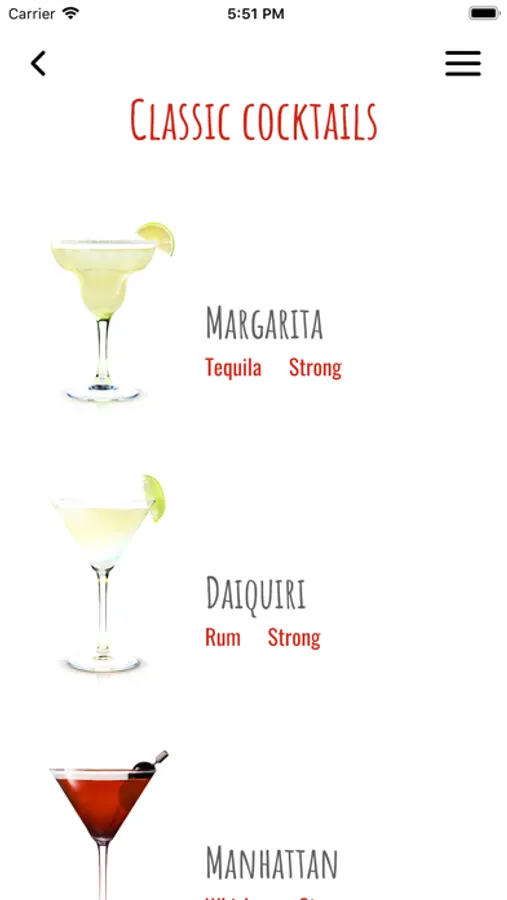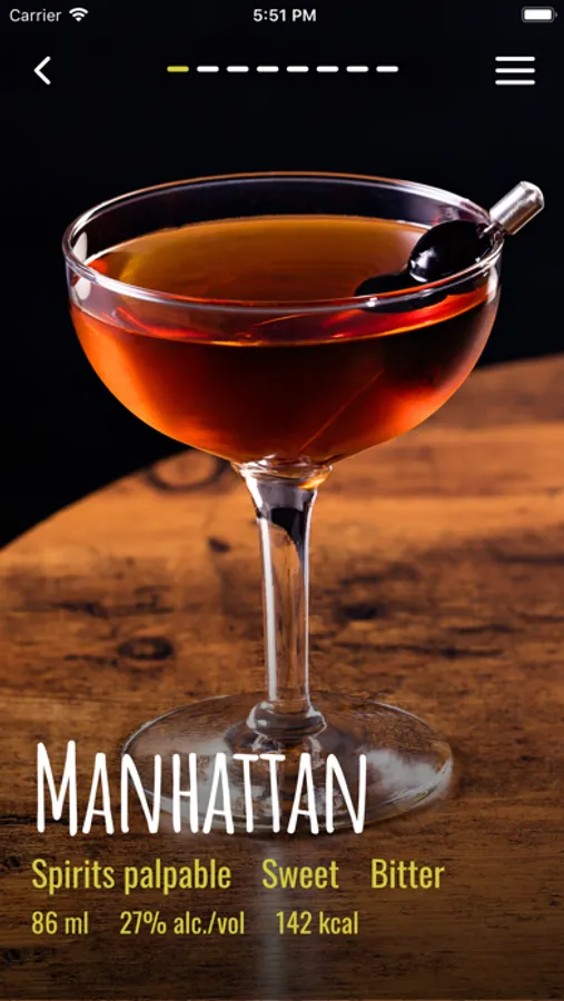 Discover more than a hundred cocktail recipes: Margarita, Daiquiri, Manhattan, Cosmopolitan, Negroni, Pina colada, Bloody Mary, Moscow mule, B52, Mint julep, Vesper, Lemon drop, Cuba libre, Long Island ice tea, Sex on the beach, Mai Tai, Tequila sunrise and many others.