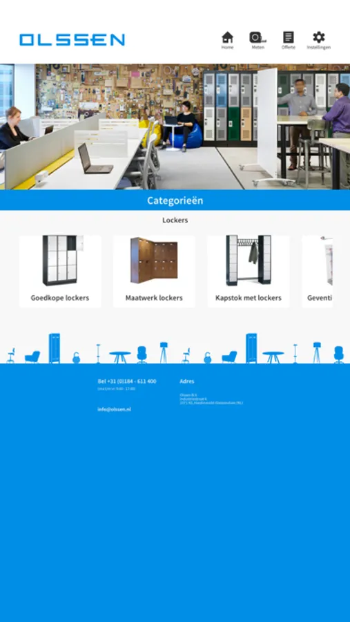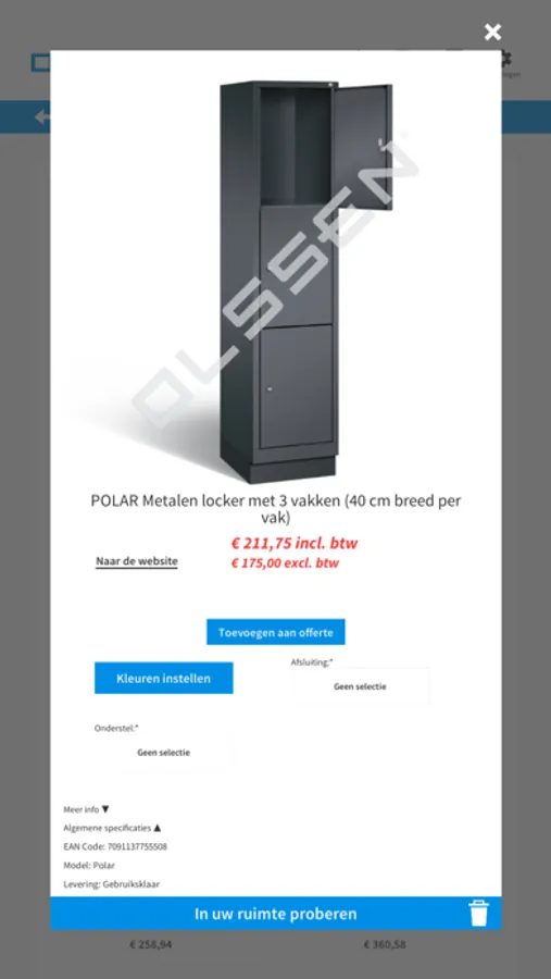 Met de revolutionaire AR app van Olssen is het mogelijk om uit te proberen of een lockerkast of ander meubel past in uw ruimte. Kies eenvoudig een product naar keuze en plaats deze virtueel met uw smartphone of tablet in de ruimte. Hierdoor ziet u niet alleen of het product qua afmeting past, maar ook of deze aansluit bij het interieur en de inrichting. Maak vervolgens een screenshot om uw gewenste inrichting op te slaan en als offerte aanvraag te versturen.