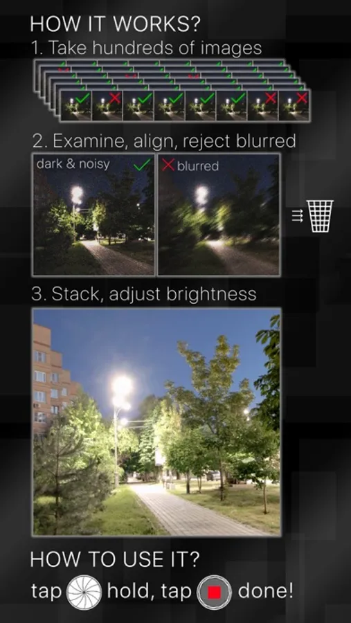 Mathematical approach is similar to algorithms used in astronomical photography (calibration, alignment dithering, averaging with sigma-clipping, filtering out blurry images). This makes it possible to achieve a radical improvement of night photos taken by your mobile device.