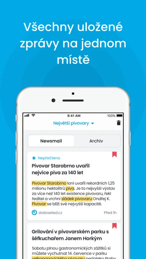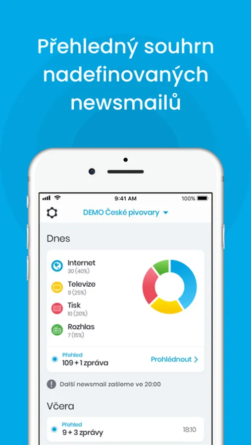 Výhody aplikace: Čtečka a archiv newsmailů, hledání v rozsáhlém mediálním archivu Newton Media, sdílení mediálních výstupů, upozornění na nový newsmail nebo zmínku v médiích, online synchronizace, jediné přihlášení, ukládání článků na později.
