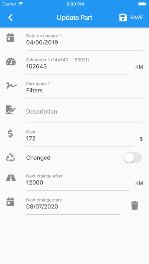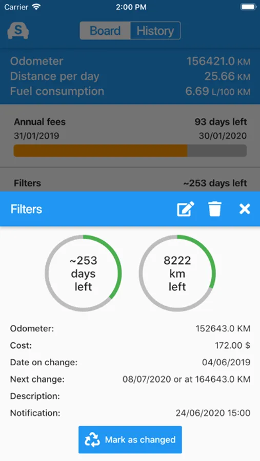 - track your part changes and repairs such as oil, tires, filters, etc.