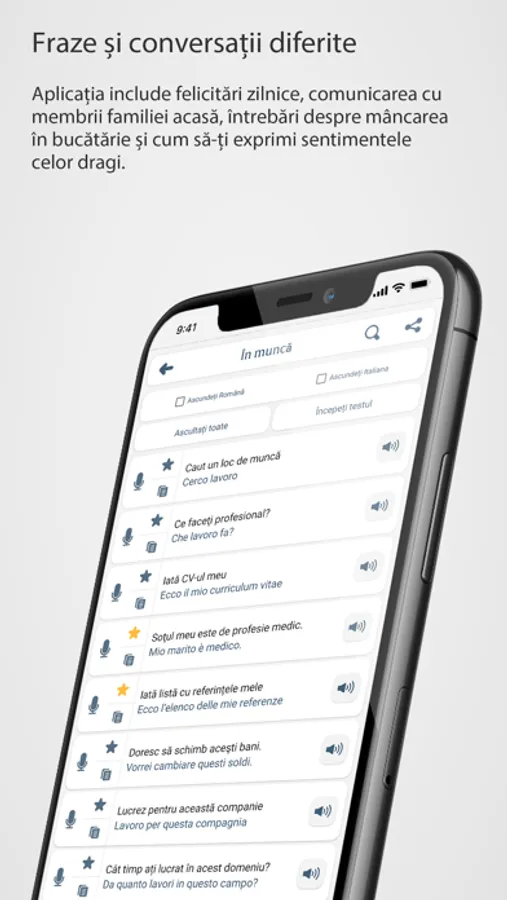 -Exersează cititul, vorbirea, ascultarea și scrierea. Aplicația oferă, de asemenea, posibilitatea de a asculta propoziția cu voce tare de la vorbitori de limba italiană.
