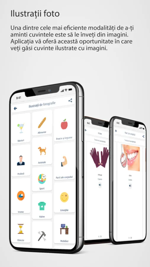 Una dintre cele mai eficiente modalități de a-ți aminti cuvintele este să le înveți din imagini. Aplicația vă oferă această oportunitate în care veți găsi cuvinte ilustrate cu imagini.
