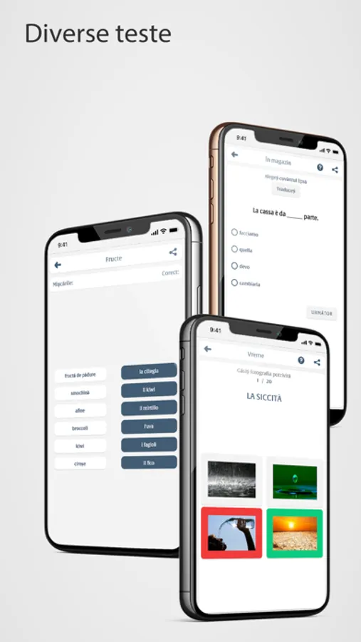 Testați-vă cunoștințele despre diferite tipuri de teste oferite de aplicație, cum ar fi: conectarea cuvintelor care au același sens, găsirea răspunsului corect din imagine, traducerea cuvântului sau propoziției, ascultarea propoziției și apoi scrierea acesteia, pronunțarea propoziției care apare, și altele.