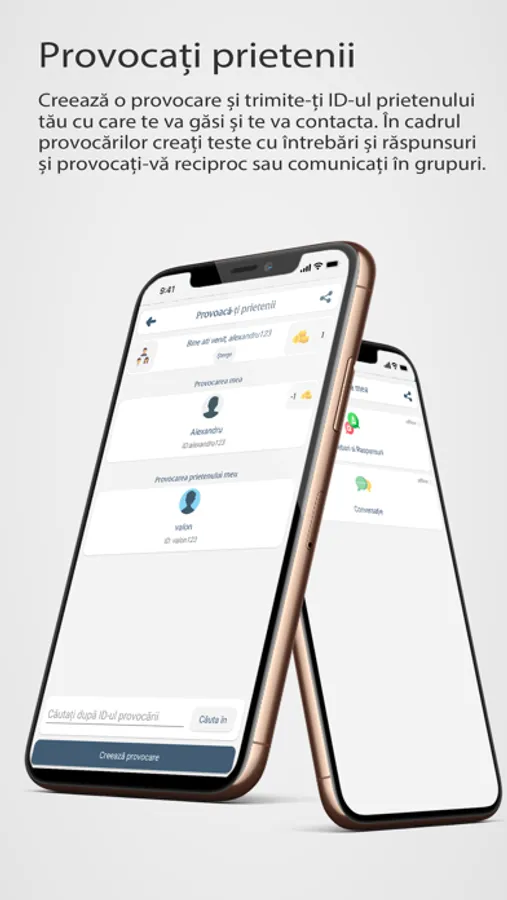 Creează o provocare și trimite-ți ID-ul prietenului tău cu care te va găsi și te va contacta. În cadrul provocărilor creați teste cu întrebări și răspunsuri și provocați-vă reciproc sau comunicați în grupuri.