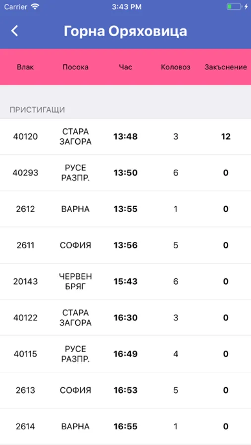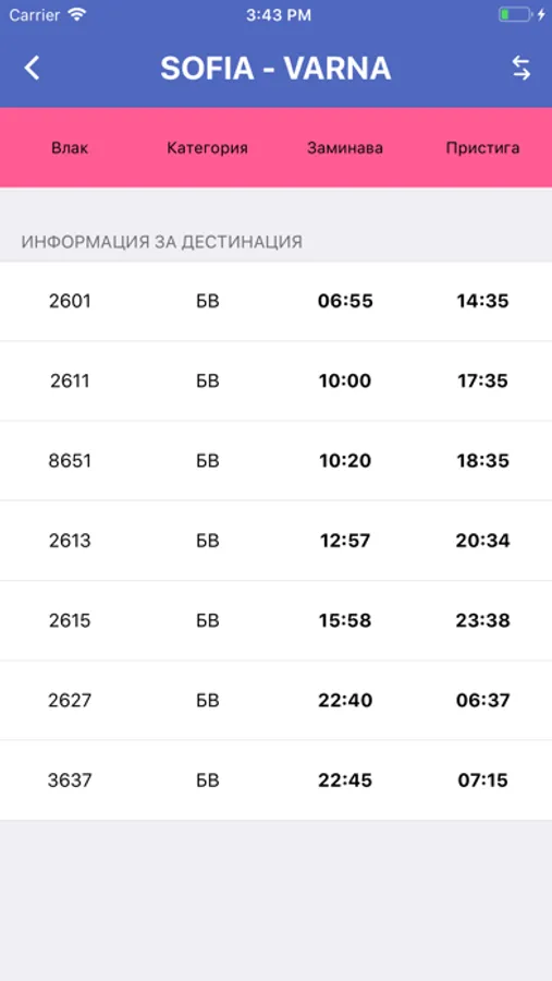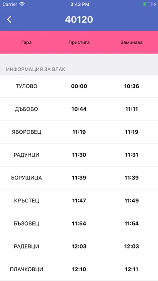 - показва време на пристигане и заминаване на влаковете по избрана от потребителя дестинация