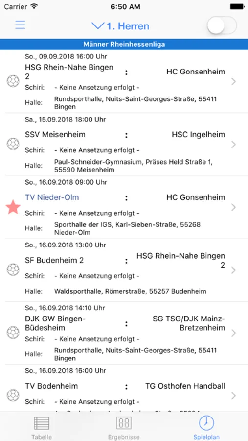 - Details zu einem Spiel (z.B. Datum, Uhrzeit, Halbzeitergebnis, Schiedsrichteransetzung, Hallenanschrift etc.)