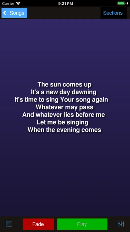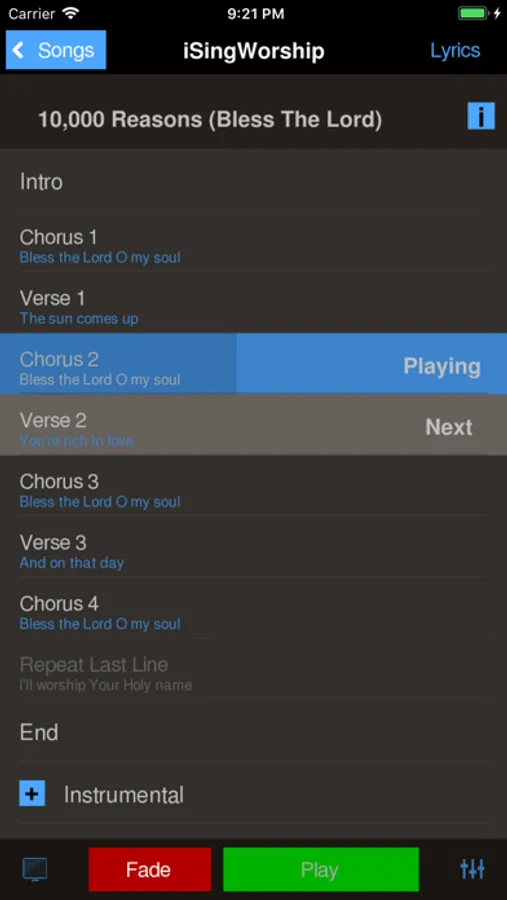 Download a song from the growing built in library and you can take out the vocal, repeat a chorus, end by going back to verse 1, break down into a quiet instrumental section to talk or pray over, or sing a chorus with just the drums playing. iSingWorship uses SATT™ (Smooth Audio Transition Technology) for incredibly smooth and natural song section changes.