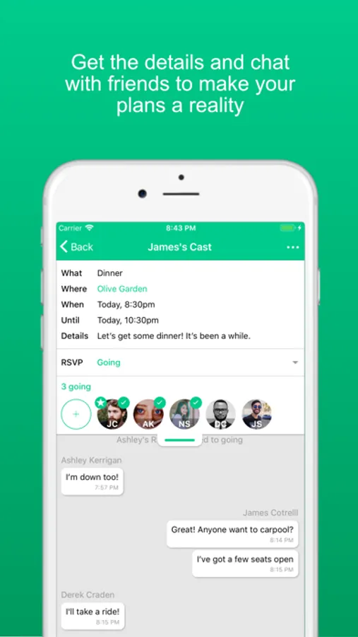 - Chat - Each Event has a dedicated group chat to help make your plans a reality and includes GIF support for a little extra fun.