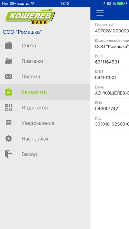 -просмотр реквизитов банковских счетов организации и передача их с помощью различных каналов и приложений, доступных на мобильном устройстве.