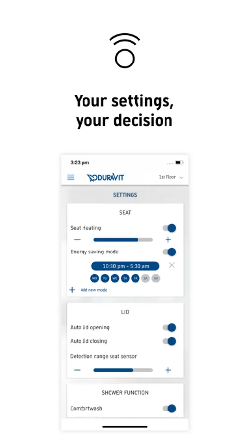 - Configure many setting options according to your needs: Define at which times of the day your SensoWash® should activate or deactivate the seat heating or determine the detection range of the seat sensor to adapt it to its environment.